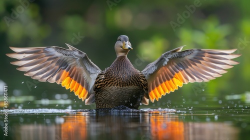 © The 2R Artificiality, Obraz premium A male Gadwall duck displaying its vibrant wing feathers by flapping at a serene lake