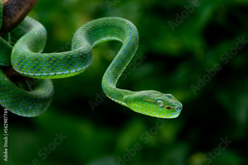 Obraz premium A male Hagen's pit viper Trimeresurus (parias) hageni on attacking steady position with bokeh background