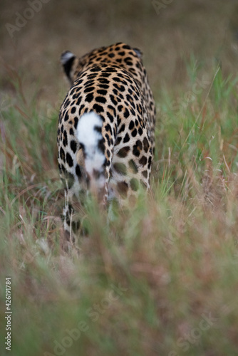 Naklejka premium A male Leopard seen patrolling his territory on a safari in South Africa