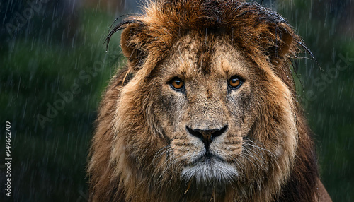 Fototapeta premium A male lion standing in the rain, droplets glistening on its mane
