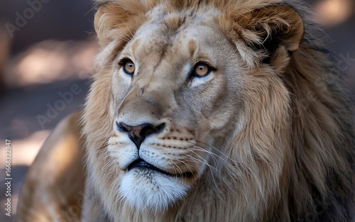 Obraz premium A male lion with a thick mane and piercing gaze looks directly forward