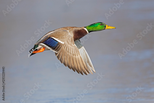 Obraz premium A male Mallard duck (Anas platyrhynchos) in flight.