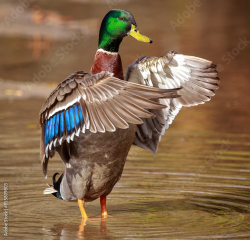 Obraz premium A male mallard duck standing upright in a pond, flapping its wings