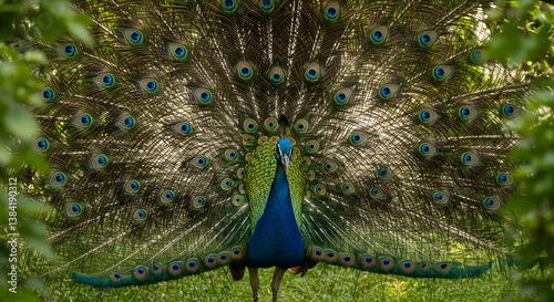 Obraz premium A male peacock displays its vibrant plumage, opening its fan-like tail in a...