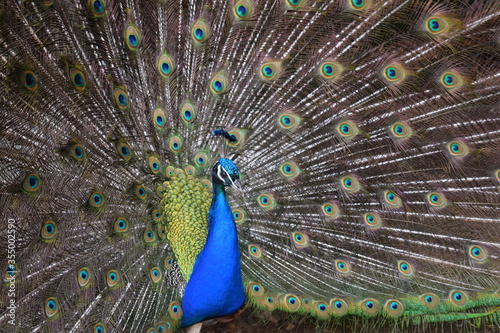 Obraz premium A male peacock shows the beautiful colors of its green-blue feathers and...