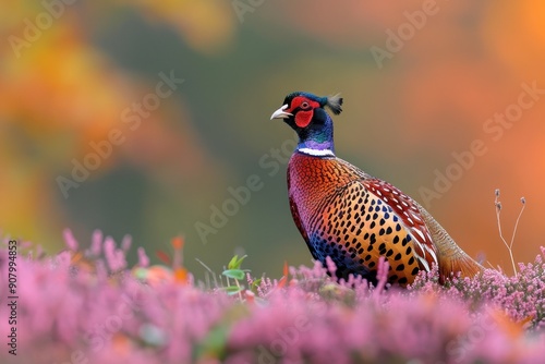 © kaleidoscope, Fototapeta premium A male ring-necked pheasant stands in a field of purple heather