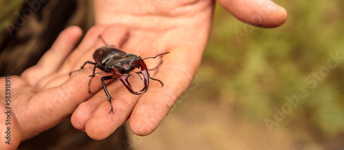 Fototapeta premium a male stag beetle in the arms of a male naturalist.