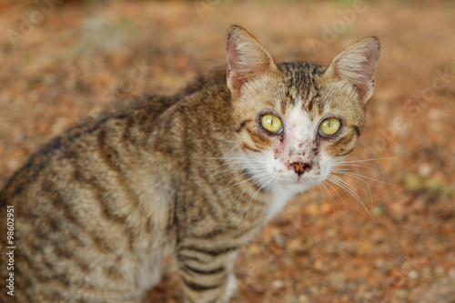 Fototapeta premium A male stray cat with dirty face looking back at us