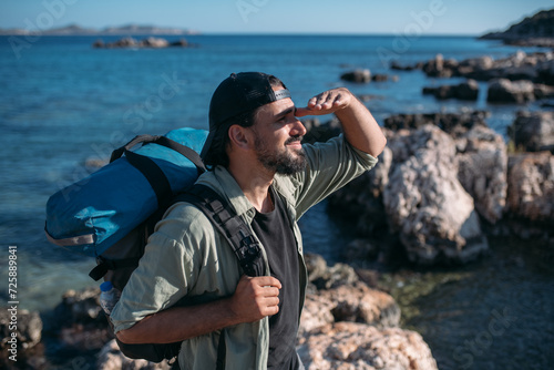 © Anna, Obraz premium A male tourist with a large backpack and hiking gear on a rocky seashore.