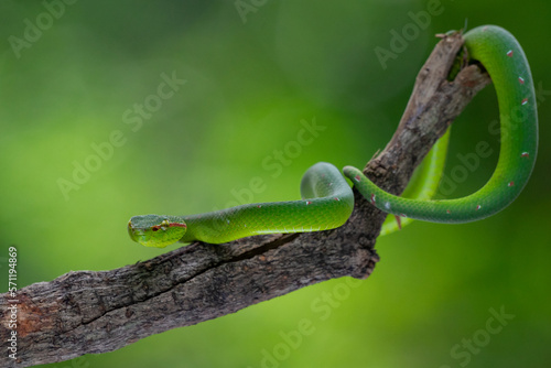 © Ralfa Padantya, Naklejka premium A male wagler's temple pit viper Tropidolaemus wagleri hanging on a branch with defensive pose using bokeh background