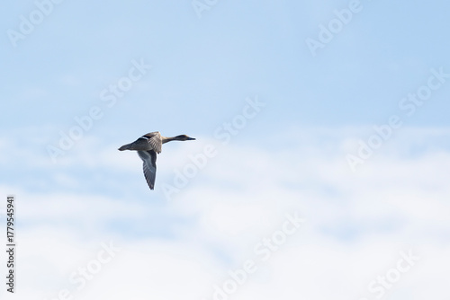 © Shchipkova Elena, Fototapeta premium A mallard duck flies in the blue sky