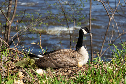 © Natalia, Obraz premium A mama goose hatching eggs. A goose mother hatching with it's goslings and eggs.