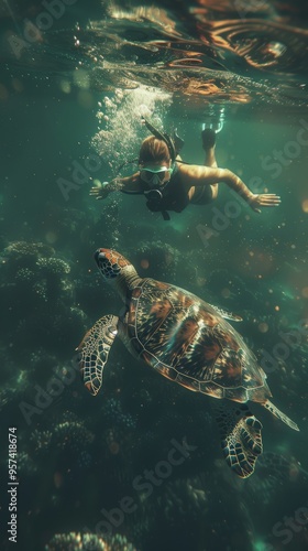© Sarbinaz Mustafina, Fototapeta premium A man and a turtle are swimming together in the ocean