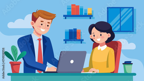 © theevit, Obraz premium A man and a woman are sitting at a desk with a laptop. The man is smiling and the woman is smiling as well. The scene is likely a work meeting or a casual conversation between the two
