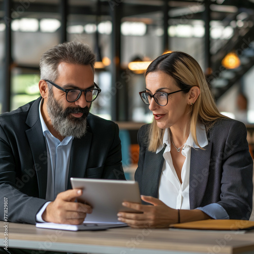 © Bogdan Pictures, Fototapeta premium A man and a woman, both wearing glasses, are seated at a table looking at a tablet. They appear to be discussing work or an engineering project at a whitecollar event