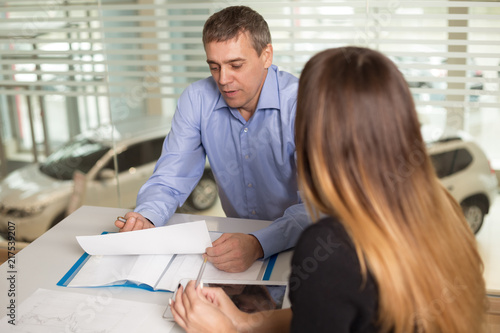 © Evgeny Sumin, Obraz premium a man and a woman work in an office and talking