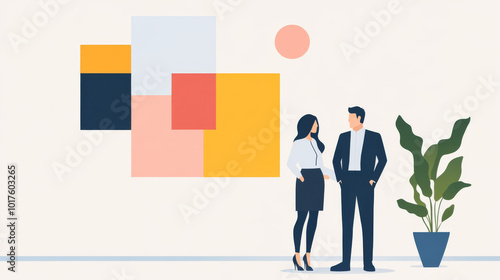 Fototapeta premium A man and woman in business attire stand before a colorful wall, engaged in...