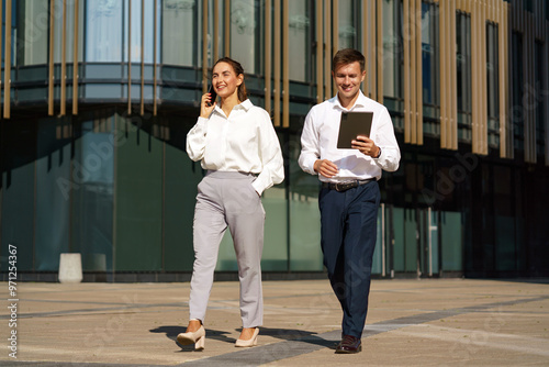 Fototapeta premium A man and woman in business attire walk confidently outdoors, with the woman on a phone call and the man holding a tablet.