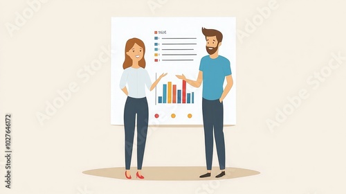 © PRIMPROW, Obraz premium A man and woman standing next to a chart displaying business performance, discussing key metrics in a flat, minimalist vector style.