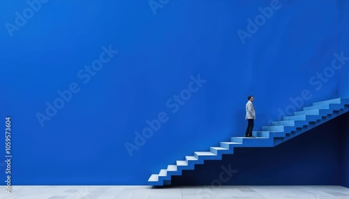 Fototapeta premium A man Ascending Blue Geometric Steps in a Modern Architectural Space