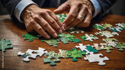 Obraz premium A man carefully assembles a green-themed jigsaw puzzle on a wooden table,...