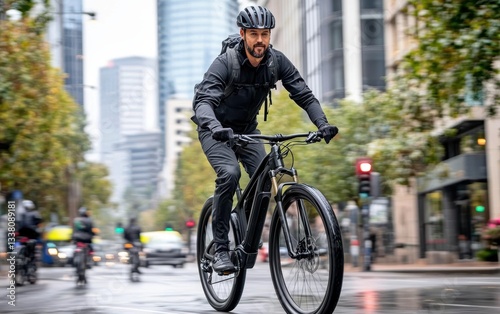 © Diffin, Obraz premium A man cycles down a rainy street, showcasing resilience against the weather.
