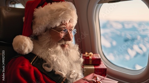 © liliyabatyrova, Obraz premium A man dressed as Santa Claus is sitting in an airplane window