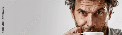 © Hifzhan Graphics, Obraz premium A man drinking hot coffee against white background, generative AI