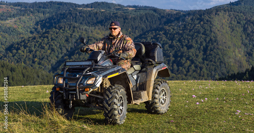 © .shock, Obraz premium A man driving a quad ATV motorcycle through beautiful meadow landscapes