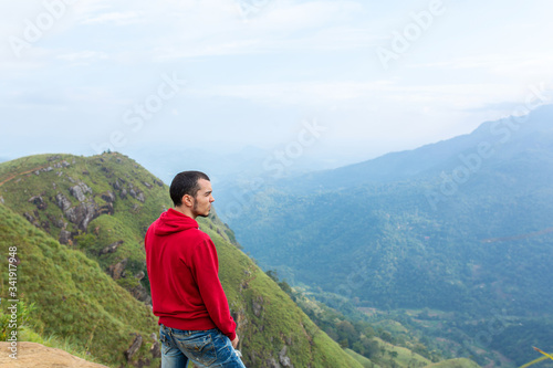 © Kate, Naklejka premium A man enjoying the mountain scenery on the edge of a cliff