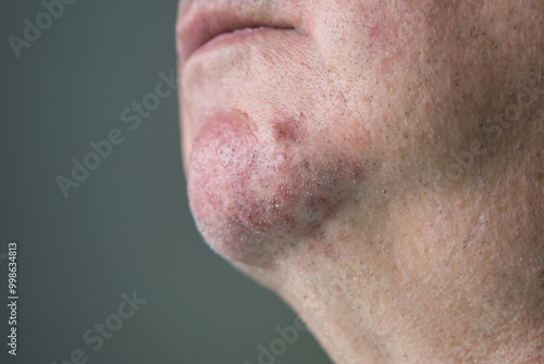 Fototapeta premium A man face chin is having red skin rashes or skin problem