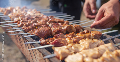 © schankz, Naklejka premium A man fries kebabs on skewers on the grill