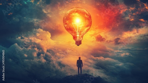 © Penatic Studio, Fototapeta premium A Man Gazing at a Giant Lightbulb in the Sky