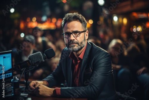 Fototapeta premium a man gives an interview in front of an audience