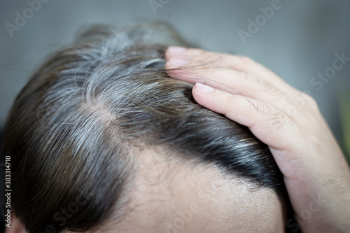 © kamonwan, Naklejka premium A man has hair growth, he has hair loss problems. Dry scalp, dandruff