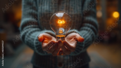 © Igbal, Obraz premium A man holding a light bulb in his hand seems to be offering a new idea, concept, innovative technology. Digital solutions.
