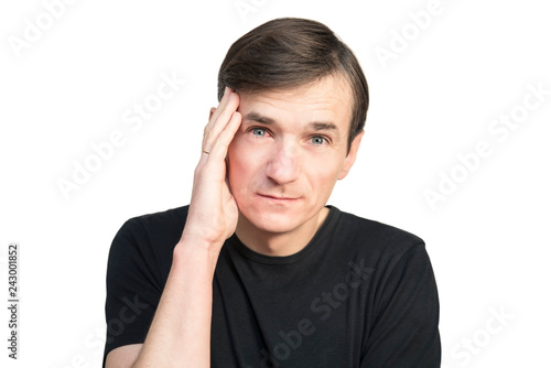 Fototapeta premium A man holds his head with a sad face on a white background. A man has a...