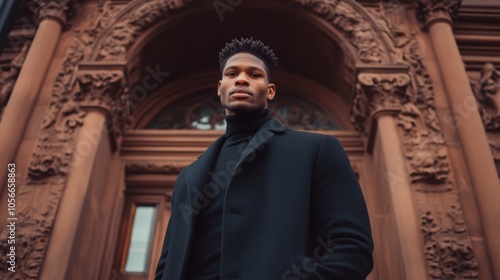 © liliyabatyrova, Naklejka premium A man in a black coat stands in front of a building
