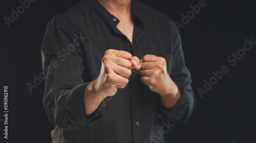 © meeboonstudio, Fototapeta premium A man in a black shirt raised his fists while standing against a black background