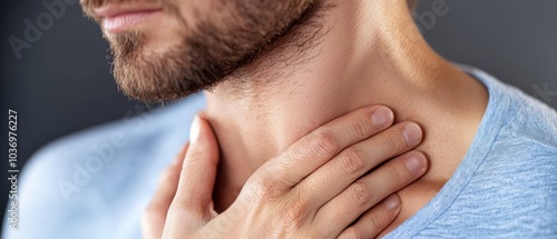 Obraz premium A man in a blue shirt, hands on chest - one hand touching