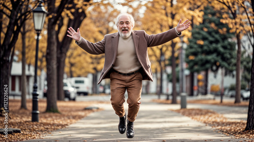 © KayKai, Fototapeta premium A man in a brown jacket and tan pants is jumping in the air