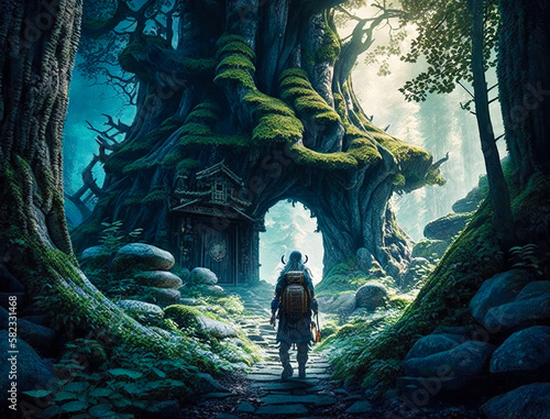 © Uolir, Fototapeta premium A man in a fantasy forest, fantasy drawing - generative AI
