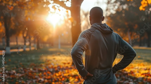 © Tri, Obraz premium A man in a hoodie is standing in a park with leaves on the ground looking up at the sun