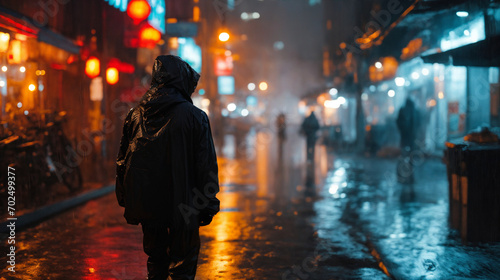 © Delta Amphule, Obraz premium A man in a hoodie raincoat standing in the rain. In the city, dystopian.