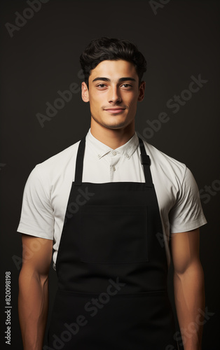 © Iuliia Pilipeichenko, Naklejka premium A man in a kitchen apron. Chef work in the cuisine. Cook in uniform, protection apparel. Job in food service. Professional culinary. Black fabric apron, casual stylish clothing. Baker. Generated AI