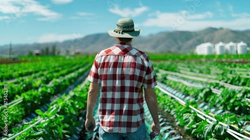 © Alice a., Fototapeta premium A man in a plaid shirt walks through a field of green plants