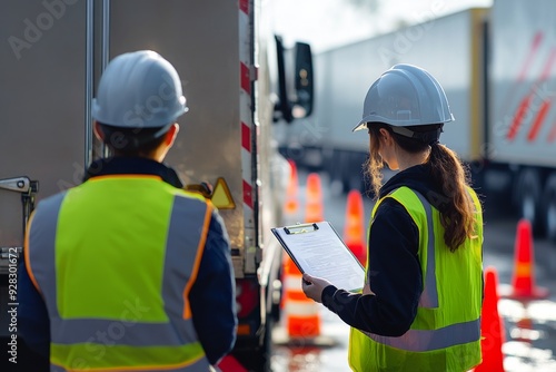 © OLKS_AI, Obraz premium A man in a protective vest with a notebook checks a truck with a trailer reversing