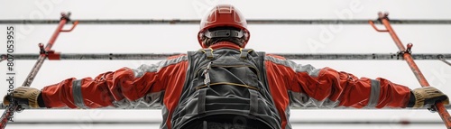 © AnuStudio, Obraz premium A man in a red jacket and a hard hat is standing on a scaffold