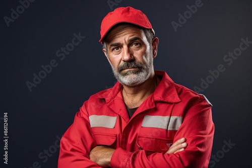 Fototapeta premium A man in a red shirt and hat is standing with his arms crossed