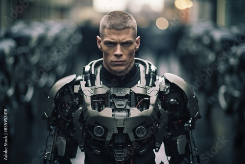 © MediaRaw, Fototapeta premium A man in a robot suit stands in front of a row of robots